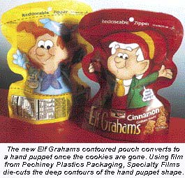 Pechiney Plastic Packaging produces the packaging film a laminate that includes an outer reverse-printed polyester film extrusion-laminated to an inner linear low-density polyethylene (LLDPE) sealant film. Printed via eight-color rotogravure, the approximately 4.5 mil thick rollstock is shipped to Specialty Films, which makes rectangular pouches and then die-cuts the deep contours of the hand puppet shape. The Elf Grahams package was developed in just six months, proceeding from a prototype to a finished product on store shelves.