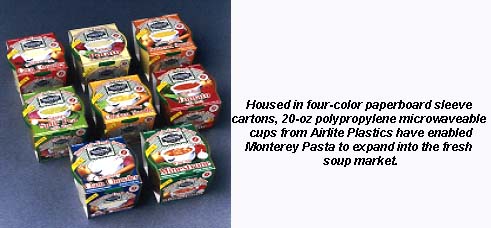 The Salinas, CA, company says refrigerated soups are the fastest growing segment of the $2 billion soup category. Lance Hewitt, president/CEO of Monterey Pasta notes that previous entrants into the category have suffered from poor packaging and difficult preparation. "For example, many products are not microwaveable in the retail package. Some are condensed, requiring added water, a can opener and a pan for heating. Others suffered from packaging that was very difficult to open and not resealable for storage," he says.